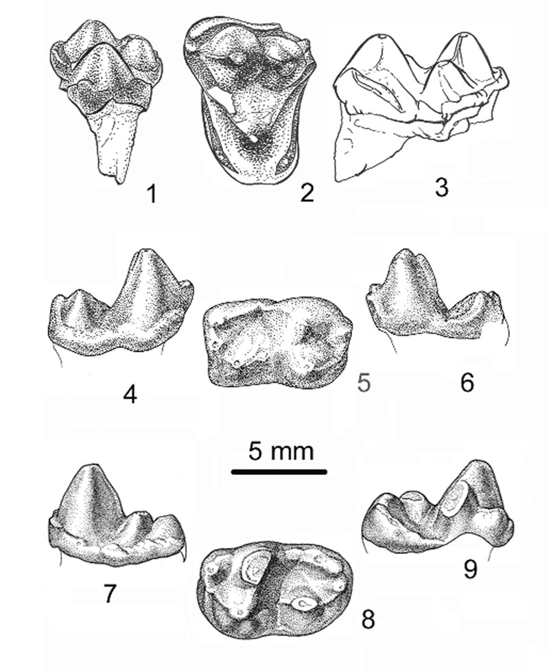 FIGURE 2. Drawings of cheek teeth of Eoconodon nidhoggi. UCMP 170847, left M1 or M2 in 1) lingual view; 2) occlusal view; 3) posterior view. UCMP 170848, right m2 in 4) labial view; 5) occlusal view; 6) lingual view. UCMP 145323, left m2 in 7) labial view; 8) occlusal view; 9) lingual view. (Figures 2.4-2.9 reproduced from Clemens and Williamson 2005).