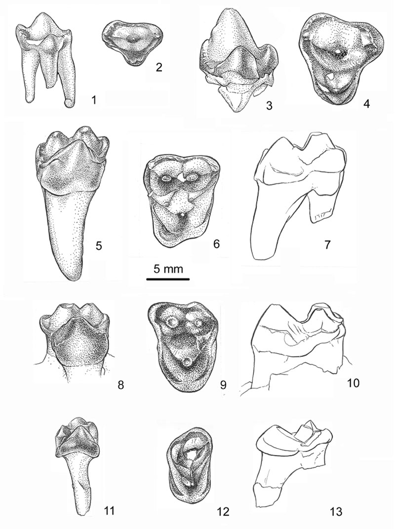 FIGURE 3. Drawings of upper cheek teeth of Eoconodon hutchisoni. UCMP 145677, right ?DP3 or DP4 in 1) lingual view; 2) occlusal view. LACM 28140, right P4 in 3) lingual view, 4) occlusal view. UCMP 156104, right M1 in 5) lingual view, 6) occlusal view, 7) posterior view. UCMP 156108, holotype, left M2 in 8) lingual view, 9) occlusal view, 10) posterior view. UCMP 156109, right M3 in 11) lingual view, 12) occlusal view, 13) posterior view.
