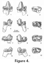 The protoconid of m3 is more robust and slightly higher than the metaconid; the paraconid is distinctly smaller and, unlike m1 and m2, situated directly in front of the metaconid (Figure 4.10-4.13). The talonids of most m3s resemble those of the other molars in that the hypoconid is the largest talonid cusp, and the slightly smaller hypoconulid is linked to the entoconid by a strong ridge (postcristid). On one tooth (UCMP 192017) the talonid basin is rimmed by a series of small cusps whose homologies are not apparent. The talonid is much narrower than the trigonid, although the degree of its diminution relative to the trigonid is variable. The labial base of the crown is expanded, and on some teeth a cingulid is present on the anterior face of the trigonid and labial side of the talonid. Of the two roots the posterior is separated from the crown by a shallow notch around the top of the root, significantly larger, and directed posteroventrally,