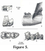 One fragment of UCMP 124393 includes parts of the symphyseal region, the alveolus for the canine, and alveoli for two, two-rooted premolars (Figure 5.1-5.2). Depth of the dentary below the premolars is ca. 2.8 cm, which is comparable to that of the posterior fragment. The positions of the premolar alveoli suggest the anterior two premolars were crowded and set en echelon with their posterior roots lingual to the anterior. There is no evidence of mental foramina on what remains of the labial side of the dentary. Medially, what remains of its rugose surface indicates the symphysis was massive. The posterior edge of the symphysis is rounded and, ventrally, projects posteriorly. From this projection a low but distinct ridge extends posteriorly, parallel to the bottom of the dentary. The second fragment consists of part of the posterior end of the dentary including the nearly vertical anterior edge of the coronoid process as well as m2 and m3 (Figure 5.3). The masseteric fossa is sharply delimited anteriorly. On the lingual side of the dentary a horizontal ridge is present ventral to the coronoid process and ca. 8 mm below the alveolar level of the ramus.
