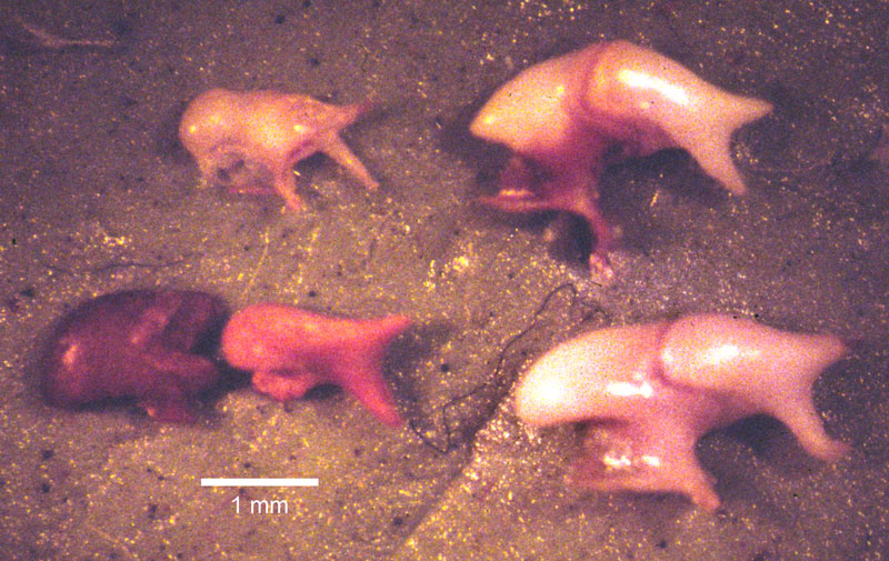 FIGURE 11. Middle ear ossicles (left malleus and incus) dissected from the skulls of several heteromyids compared with fossil ossicles of Prodipodomys. At upper left, modern Chaetodipus intermedius; upper right, modern Microdipodops pallidus; lower left, Pliocene Prodipodomys idahoensis from MNA locality 318; lower right, modern Dipodomys merriami. The ossicles are articulated in the modern specimens.