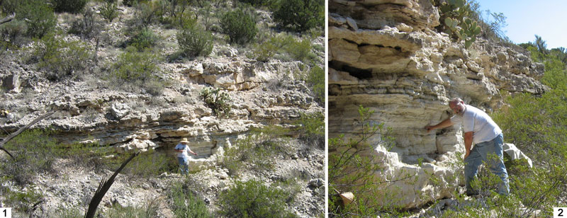 FIGURE 3. MNA locality 318 on the south flank of House Mountain, Arizona. 3.1. View northward from across the canyon. Fossils were collected from the light-colored mudrocks in the center of the photograph beneath the horizontal limestone ledges extending across the photo. K. Davies points out the hollow in the outcrop behind him from which the blocks were quarried and plaster-jacketed for this study. 3.2. Close-up view northeastward of the same outcrop. K. Davies' right hand is on the level that contained the richest assortment of microvertebrate bones.