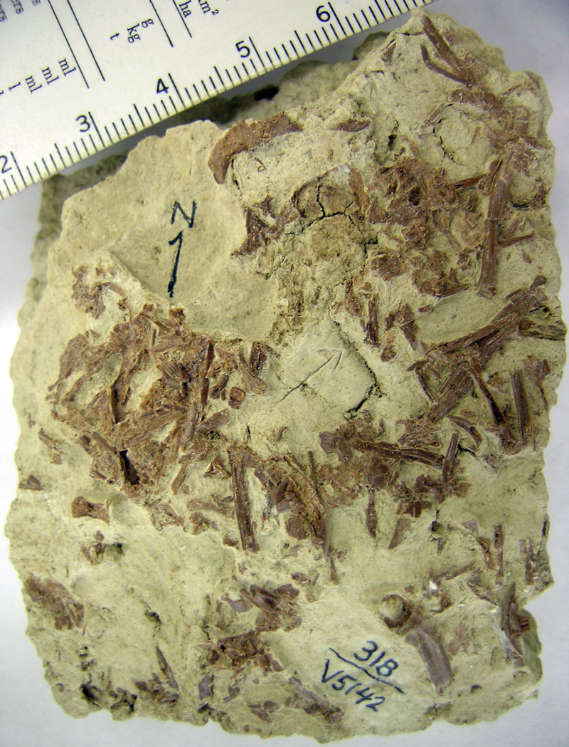 FIGURE 4. One of the small blocks that was prepared and mapped into the overall quarry map of the microvertebrate deposit at MNA locality 318, showing the general quality of bones. Scale is numbered in centimeters. This piece is also shown in Figure 8.2.7.