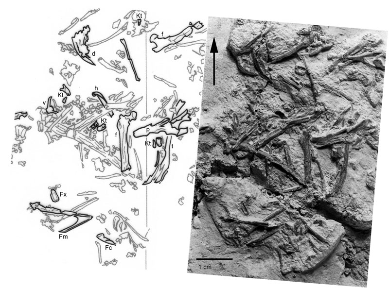 FIGURE 8.2.10. Area in the east half of grid square 1S+1W and west edge of 00+1E showing a finch mandible (Fm), manual phalanx (Fx), and partial coracoid (Fc), several Prodipodomys cheek teeth (Kt), humerus (h), innominate (p), femur (f), tibia (t), and proximal caudal vertebra (v), and a rodent dentary with i1 (d).
