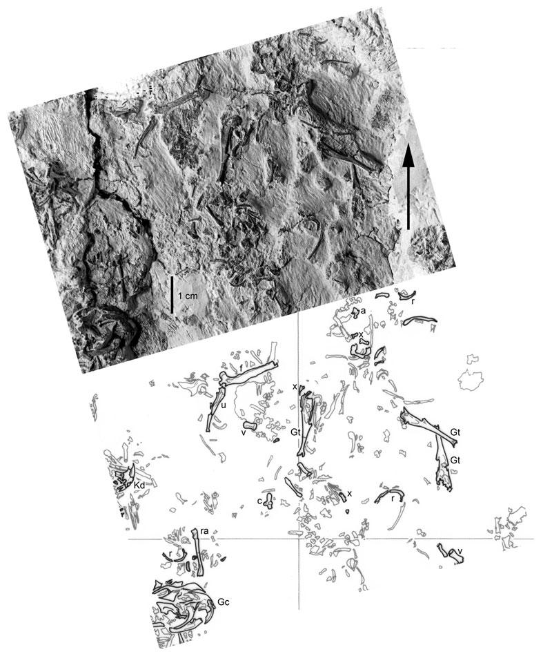 FIGURE 8.2.11. Area in the southeast corner of 00+3W, southwest portion of 00+2W, and northeast portion of 1S+3W showing Geomys minor partial cranium (Gc; the same one as seen in Figure 8.2.3) and three tibiae (Gt), Prodipodomys partial dentary (Kd), and rodent astragalus (a), calcaneus (c), femur (f), phalanges (x), radius (ra), ribs (r), ulna (u), and vertebrae (v).