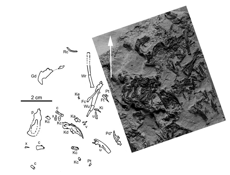 FIGURE 8.2.7. Close-up photograph and key identifying certain elements in a small portion of a Pliocene microvertebrate bone accumulation quarried from the Verde Formation at House Mountain, Arizona. c, caudal vertebra; Fc, finch coracoid; Ft, finch tarsometatarsus; Gd, pocket gopher (Geomys minor) dentary; Kc, kangaroo rat (Prodipodomys idahoensis) cheek tooth; Ke, kangaroo rat incus; Ki, kangaroo rat incisor; Ka, kangaroo rat astragalus; Pd*, pocket mouse dentary (this dentary is the holotype for Perognathus strigipredus, within a small block of matrix and bones cataloged as MNA V5142; Czaplewski 1990); Pt, pocket mouse tooth; p, pelvis; Rc, rodent clavicle; u, ulna; v, thoracic vertebra; Wr, woodrat (Neotoma vaughani) radius; Wu, woodrat ulna; x, ungual phalanx. Arrow points northward. Same view and block as in Figure 4.
