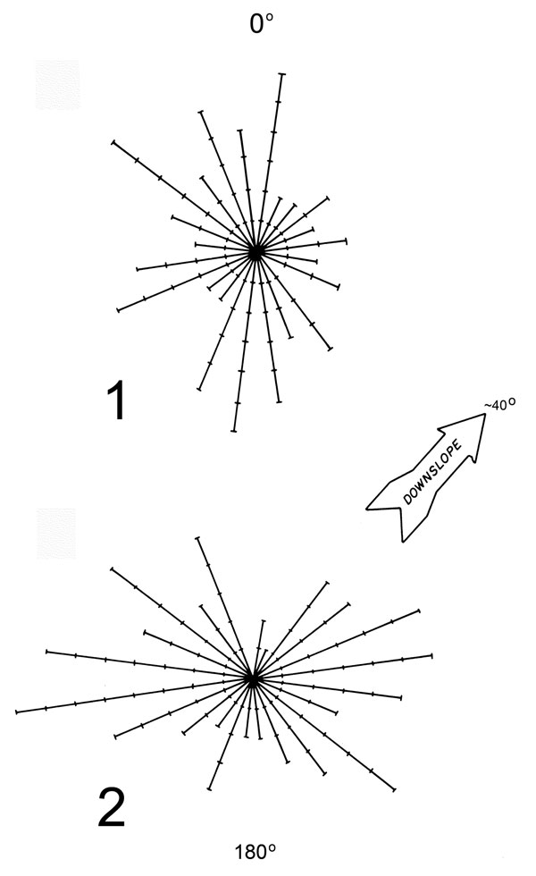 FIGURE 9. Circular histograms of the trend (directional orientation) of long bones: 9.1, for microvertebrate fossils from MNA locality 318, Verde Formation (N = 82); 9.2, for prey remains in a modern accumulation of great horned owl pellets (N = 95).
