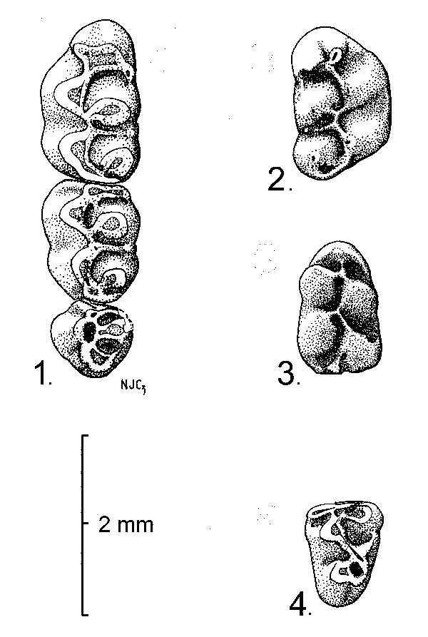 FIGURE 2. Postcopemys repenningi, gen. and sp. nov. from the Verde Formation, Arizona; occlusal views of molars. 1, left M1-2 (holotype, MNA V4996) and M3 (MNA V4997). 2, right M1 (MNA V5003). 3, right m1 (MNA V5003). 4, left m3 (MNA V4998). Anterior is at top of figure.