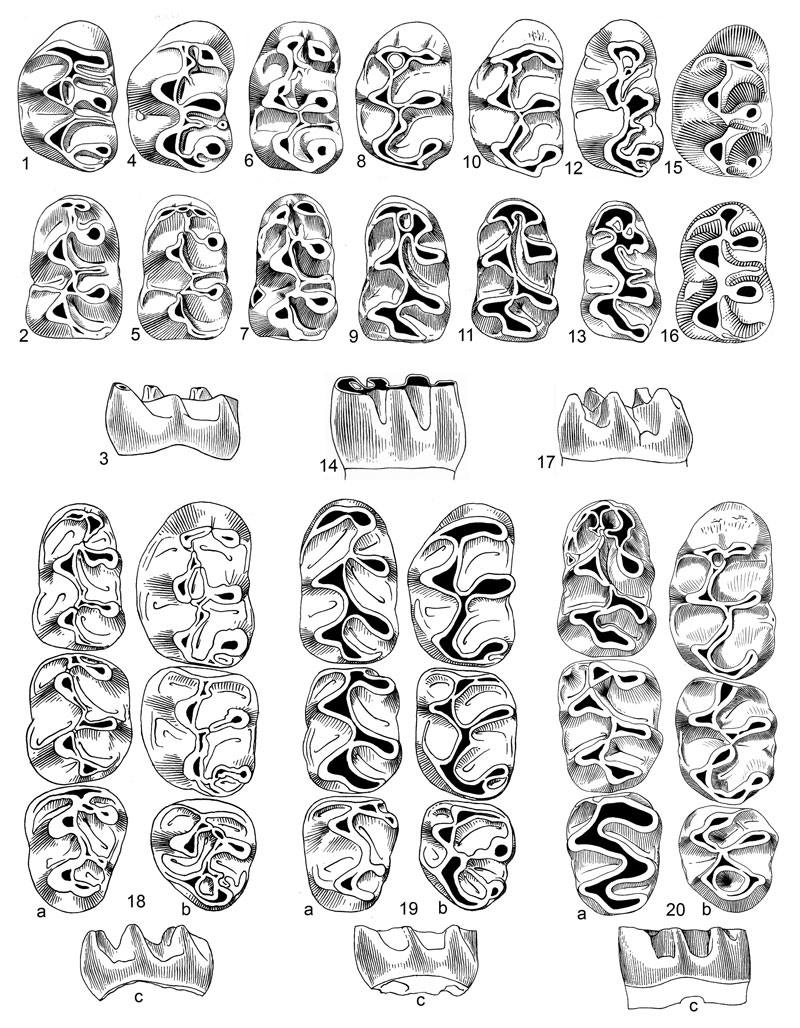 FIGURE 2. Examples of Late Miocene Cricetids I: potential ancestors of the microtoid adaptation. 1-3: Democricetodon gaillardi (Schaub, 1934) from Sansan, middle Miocene, MN 6, France; 4, 5: Democricetodon cf. freisingensis Fahlbusch, 1964 from Rudabanya, early Vallésian, MN 9, Northeast Hungary; 6, 7: Kowalskia intermedia Fejfar, 1970 from Ivanovce at Tren?ín, late Ruscinian, MN 15, Western Slovakia; 8-11, 20: Rotundomys bressanus Mein, 1975 from Soblay (Ain), middle Turolian, upper level of MN 10, Southeast France; 12-14: Anatolomys teilhardi (Schaub, 1934) from Ertemte 2, inner Mogolia, late Turolian MN 13, China; 15: Copemys tenuis Lindsay, 1972 and 16: Copemys barstowensis Lindsay, 1972 from the Barstow Formation, middle Miocene, California, USA; 17: Copemys esmeraldensis Clark, Dawson and Wood, 1964 from the upper part of the Barstow sequence, Barstovian, California, and the Esmeralda Formation, Clarendonian, Nevada, both middle Miocene,USA; 18: Rotundomys sabadelliensis (Hartenberger, 1966) from Can Llobateres, early Vallésian, upper level MN 9, Spain; 19: Rotundomys montisrotundi (Schaub, 1944) from the lignites of Montoulieres, Hérault, middle Turolian, lower level of MN 10, France. – 1-16, 18ab, 19ab, 20ab: occlusal views of the M1 (1, 4, 6, 8, 10, 12, 15), M1-3 (18b, 19b, 20b), m1 (2, 5, 7, 9, 11, 13, 16) and m1-3 (18a, 19a, 20a); 3, 14, 17, 18c, 19c, 20c: buccal views. All figured as left molars; not to scale.
