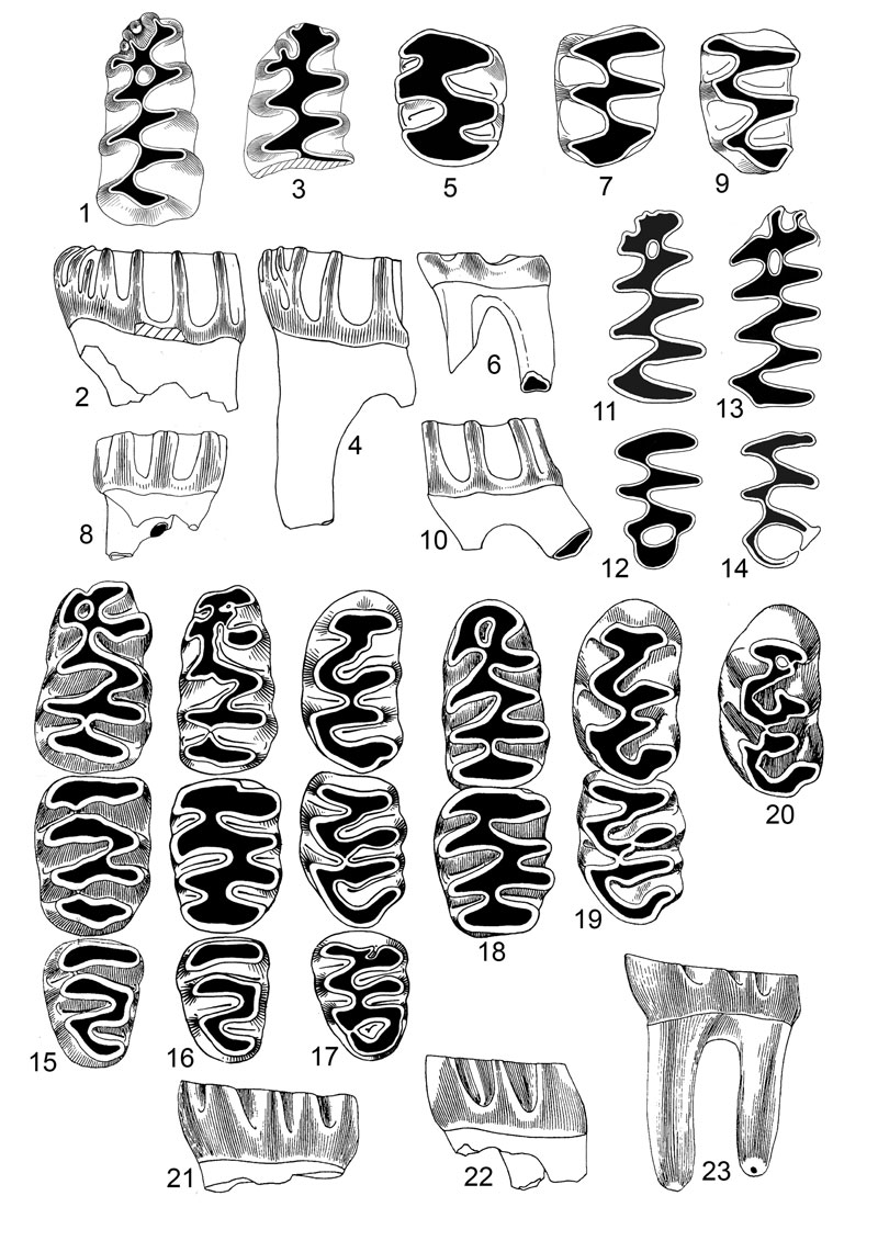 FIGURE 3. Examples of late Miocene Cricetids II: the earliest records of microtoid-prismatic morphology in molars. 1-14: Pannonicola Kretzoi, 1965 (= Ischymomys Topachevskij, et al. 1978): 1-12: Pannonicola brevidens Kretzoi, 1965 from Sümegprága (1-4, 9-10), from from Jászladány (5, 6, the Type) and Nyárád (7, 8), all late Pannonian, Turolian, MN 11, N. Hungary; 11 - 12: Pannonicola brevidens Kretzoi, 1965 from Frunzovka 2 at Odessa, late Pannonian, Turolian, MN 11, Ukraine; 13, 14: Pannonicola quadriradicatus (Zazhigin, 1972) from Ishim strata, on the right bank of the Ishim River, Petropavlovsk, late Pannonian, Turolian, MN 12, Kazakhstan; 15 - 23: Microtocricetus molassicus Fahlbusch and Mayr, 1975 from Hammerschmiede, Bavarian freshwater molasse, early Vallésian, MN 9, Southeast Germany (15-17) and Rudabanya, early Vallésian, MN 9, Northeast Hungary, (18-23). – 1, 3, 5, 7, 9, 11-14, 15-20: occlusal views, 2, 4, 6, 10, 21-23: buccal views, 8: lingual view; 1, 3, 11, 13: m1; 20: M1; 12, 14: M3; 15-16: m1-3; 18: m1-2: 17: M1-3; 19: M1-2. All figured as left molars; not to scale.