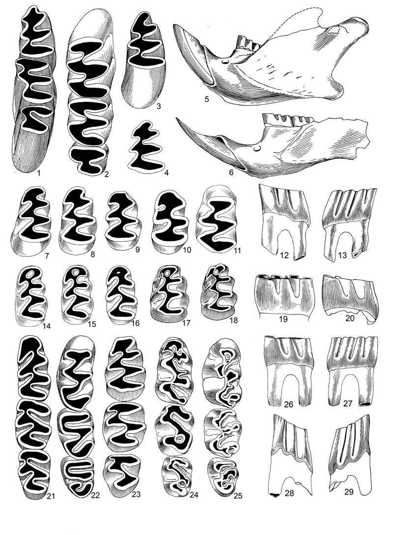 FIGURE 5. 1, 2, 4, 5: Trilophomys depereti Fejfar, 1961 from Ivanovce at Tren?ín, late Ruscinian, MN 15, Western Slovakia; 3, 28, 29: Trilophomys schaubi Fejfar, 1961 from Ivanovce at Tren?ín, late Ruscinian, MN 15, Western Slovakia; 7-13: Bjornkurtenia canterranensis (Michaux, 1976) from Gundersheim near Worms, late Ruscinian, MN 15, Western Germany; 6, 14-16, 21, 22, 26, 27: Baranomys longidens (Kowalski, 1960) from Gundersheim 2 near Worms, Western Germany (14-16, 26, 27) and Ostramos 7, N. Hungary, late Ruscinian, MN 15 (21, 22, 6); 17, 18, 20, 23: Celadensia nicolae Mein, Moissenet et Adrover, 1983 from Celadas 8, late Turolian (MN 13, eastern Spain; 19, 24, 25: Anatolomys teilhardi Schaub, 1934 from Ertemte 2, Inner Mongolia (Nei Mongol), late Turolian MN 13, China. - 1, 21, 23, 24: m1-3; 2, 22, 25: M1-3; 3, 4, 7-13, 14-20, 26-29: m1; 5, 6: lower right jaws, buccal views. 12, 19, 20, 26, 28: buccal views; 13, 27, 29: lingual views. All figured as left molars; not to scale.