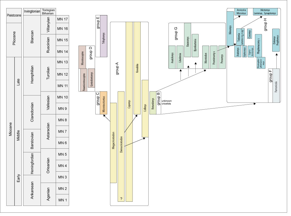 FIGURE 7. Stratigraphic distribution and possible phylogenetic relationships of taxa mentioned in the text. See text for tooth group definitions - thus according to Fejfar and Repenning (1998).
