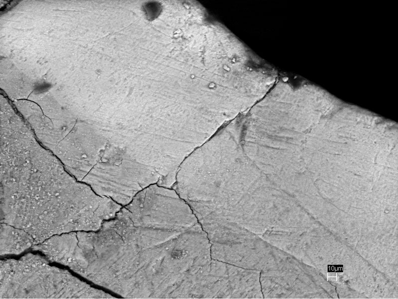 FIGURE 10. Photograph of the wear surface on a hadrosaur tooth from the Prince Creek Formation, Alaska (DMNH 22143). Note the higher density of microwear features on this tooth compared to those observed in Figure 7.