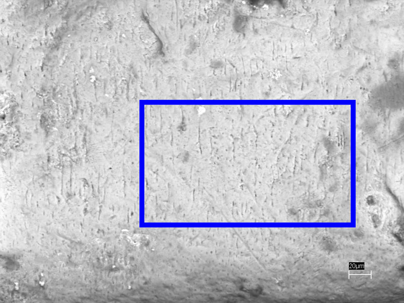 FIGURE 2. Photograph of the dentine wear surface of a hadrosaur tooth from the Lance Formation, Wyoming (DMNH[Denver]20378A) exhibiting the linear microstructure of the tooth expressed on the wear surface, outlined by rectangle.