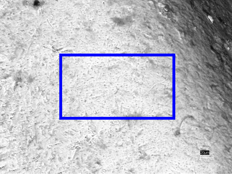 FIGURE 3. Photograph of the dentine wear surface of a hadrosaur tooth from the Lance Formation, Wyoming (DMNH[Denver]20378B) exhibiting the porous aspect of the microstructure of the tooth expressed on the wear surface, outlined by rectangle.
