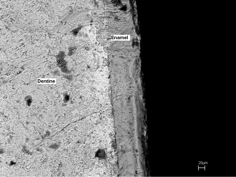 FIGURE 6. Photograph of the wear surface of a hadrosaur tooth from the Aguja Formation, Texas (TMM 42335-68C) showing the expression of coarser wear on the relatively softer dentine compared to that exhibited on the harder enamel. Notice the prominent, broad scratch in the dentine near the top of the image compared to the diminished scale of the same feature in the corresponding enamel.