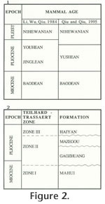 Teilhard de Chardin and Trassaert (1937) recognized three zones, which we were able to correlate to the observed succession (Figure 2). Zone I corresponds to our late Miocene Mahui Formation. Much of the Yushe sequence is Zone II, early to mid-Pliocene, and we recognized two units, the Gaozhuang and Mazegou formations. These Pliocene units and their faunas were employed by
