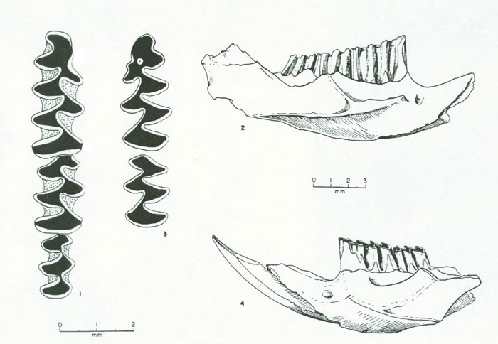 FIGURE 1. Occlusal and lateral views of Frick collection microtines from Nan Zhuang Gou. Right dentary F:AM 116248, Mimomys (Cromeromys) gansunicus (1, 2). Left dentary F:AM 116247, Mimomys (Mimomys) orientalis (3, 4). Separate millimeter scales for the occlusal views and lateral views (drawings by Charles Repenning).