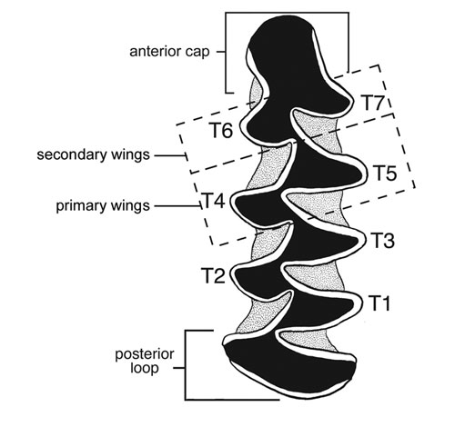 FIGURE 2. General structure and features of the lower first molar in arvicoline rodents showing position of primary and secondary wings. Individual triangles are referred to by a capital "T" and a unique number (e.g., T1). Enamel closure between T1 and T2 depicts a closed triangle state. Confluence of T6 and T7 depicts an open triangle state. Modified from Bell and Jass (2004).